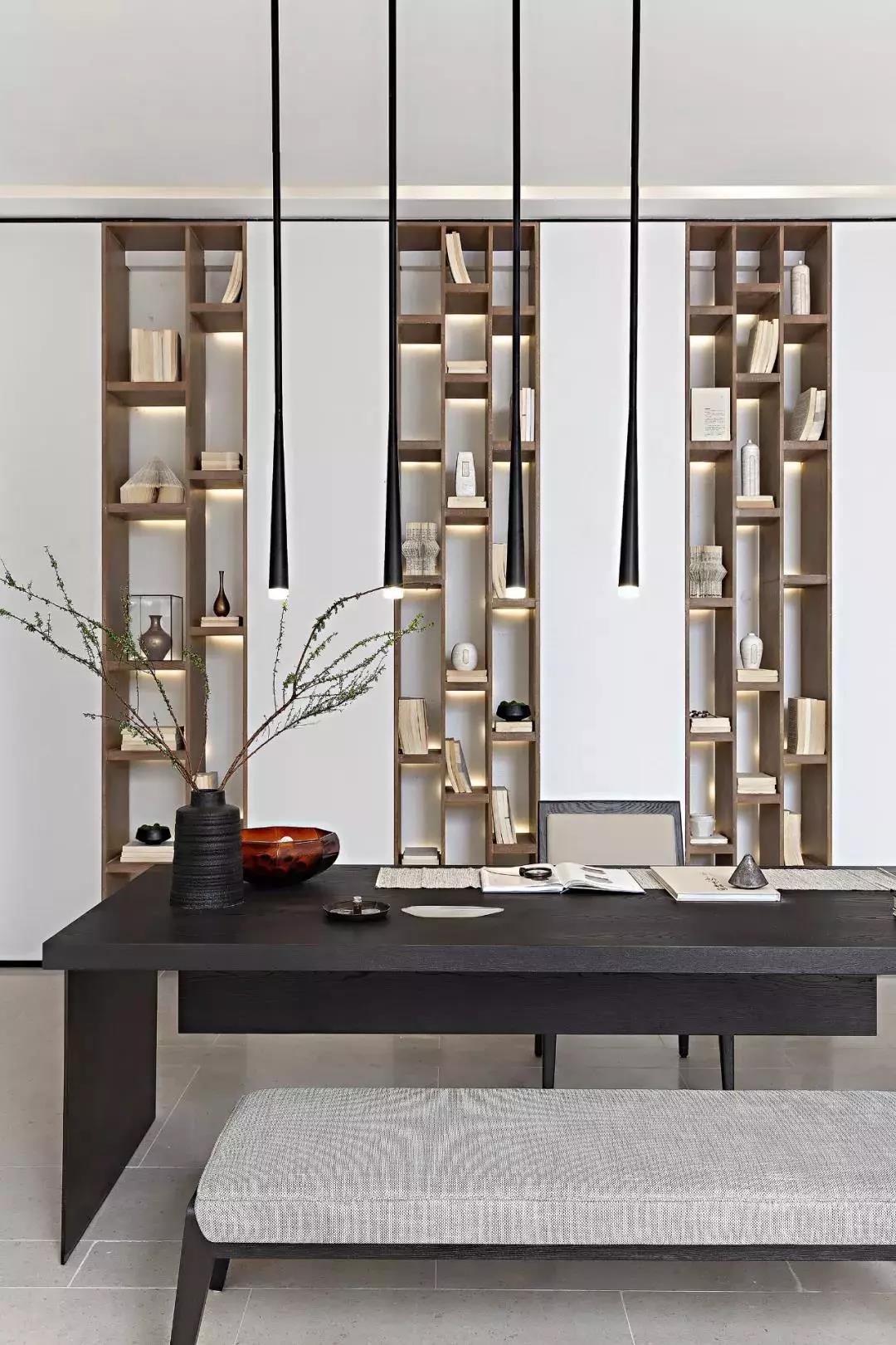 ![]() ![]() ![]() 规避了浓墨重彩装饰的书房,仅用轻描淡写的山水实物画就表达出了主人的心境。所有的装饰点缀的恰到好处,既不沉闷,也不浮躁,满满诗意的空间里弥漫着清幽淡雅的书香味。 ![]() ![]() ![]() 青色是百搭色,可理解为中式高级灰,轻松营造优雅与高贵的气质。 ![]() 结合光线,灯具,配以简洁的家具陈设,带给人空灵感,赋予空间独有的意境。 ![]() ![]() 搭配技巧:石材,织物,陶艺,干枝最适合用于本搭配手法,用以表达禅意或静雅。
