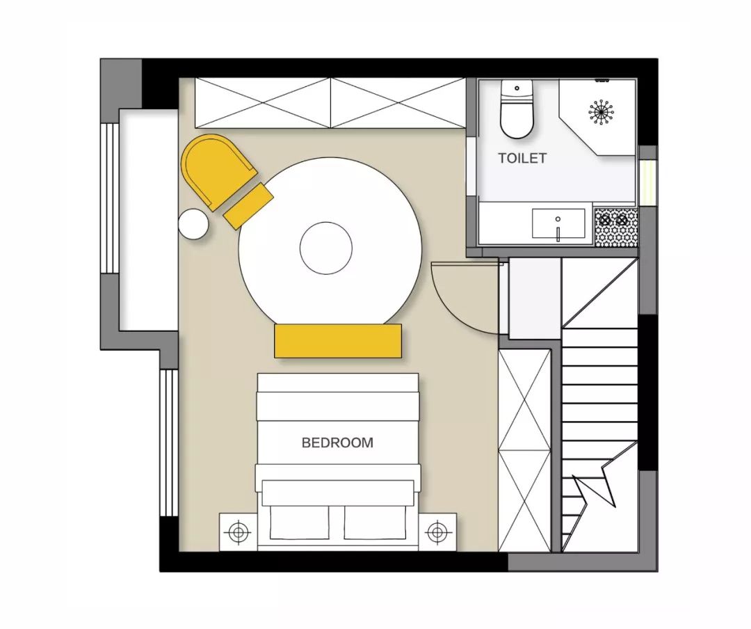 ❶ 楼梯底部的空间用作卫生间独立洗手区域; ❷ 二楼在满足正常使用下适当减少卫生间面积划与主卧使用,在增加储物空间的同时,又使房间变得宽敞通透。 |