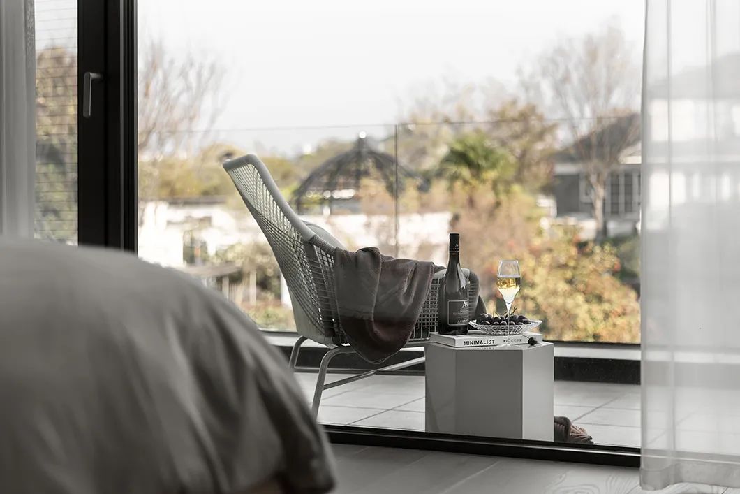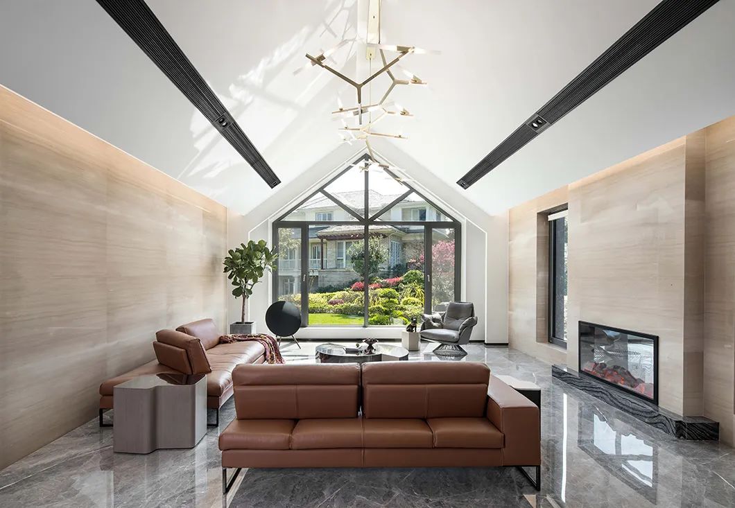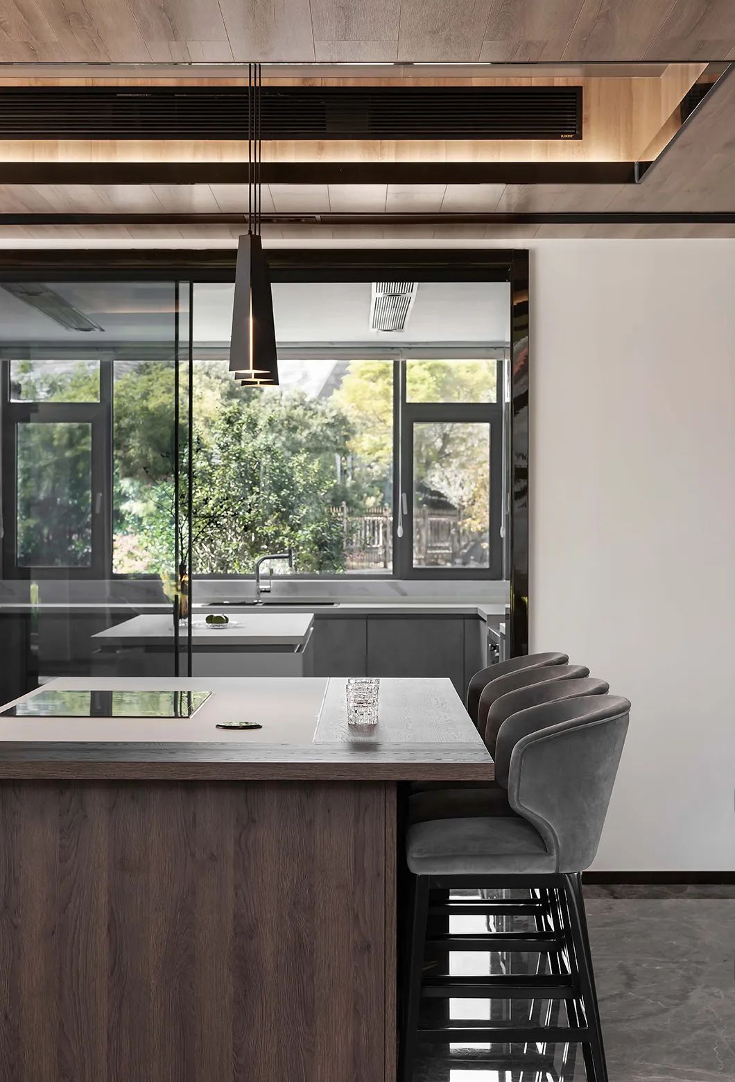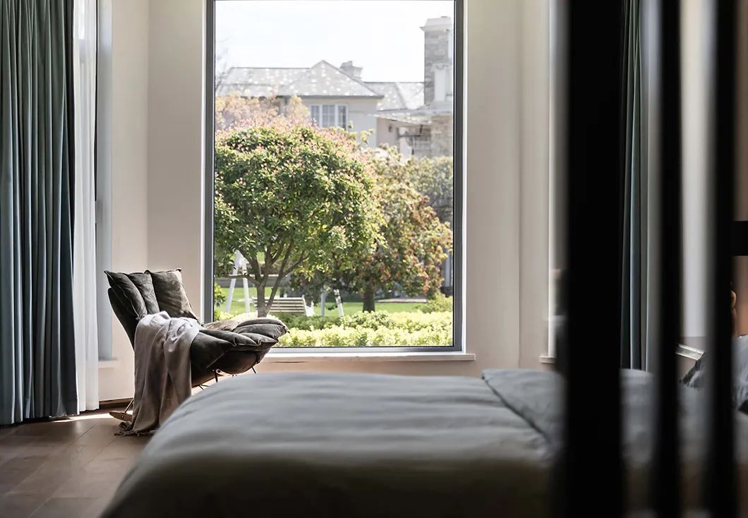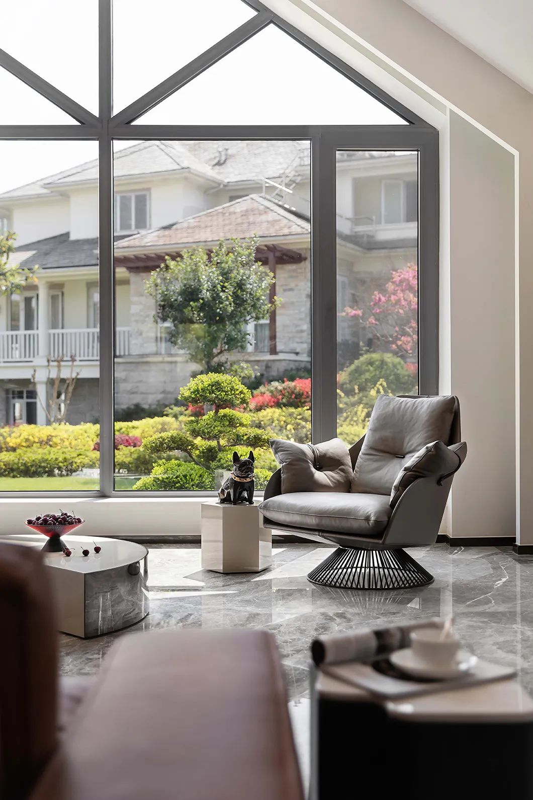 ![]() 宽敞明亮的落地窗迎合自然环境,为主人呈现了犹如巨幕电影版的长卷式观察视角,安坐在深色绒布椅上,收到阳光的问候,安适又闲在,户外美景入目,流连忘返。