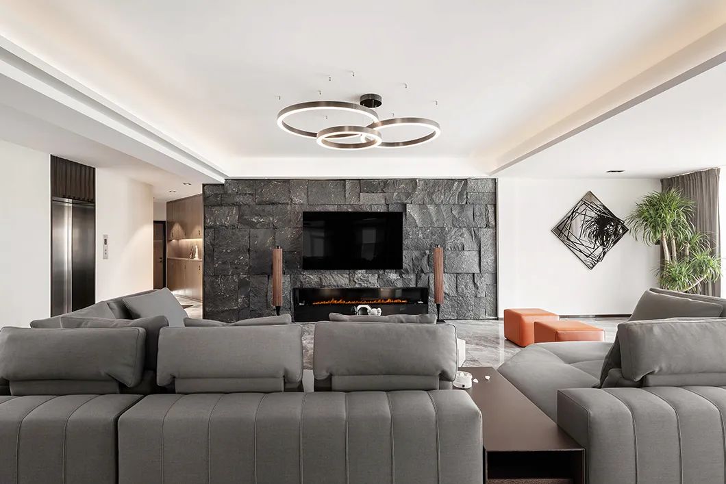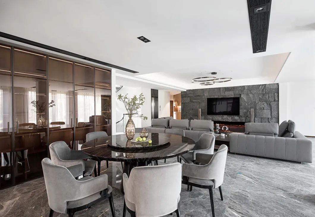 黑白灰是整个空间的主色调。客厅以轻松自然的氛围为基调,除去纷繁复杂的装饰,天然石材为背景,开阔通透的空间视觉感,简雅中不失格调,为整个空间增添了新的生命力。