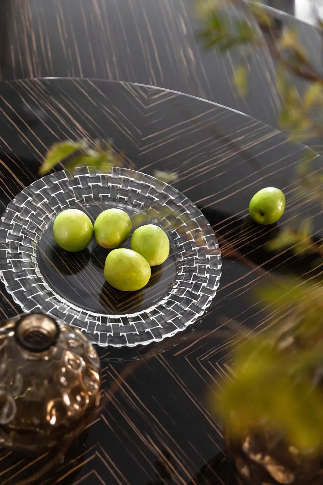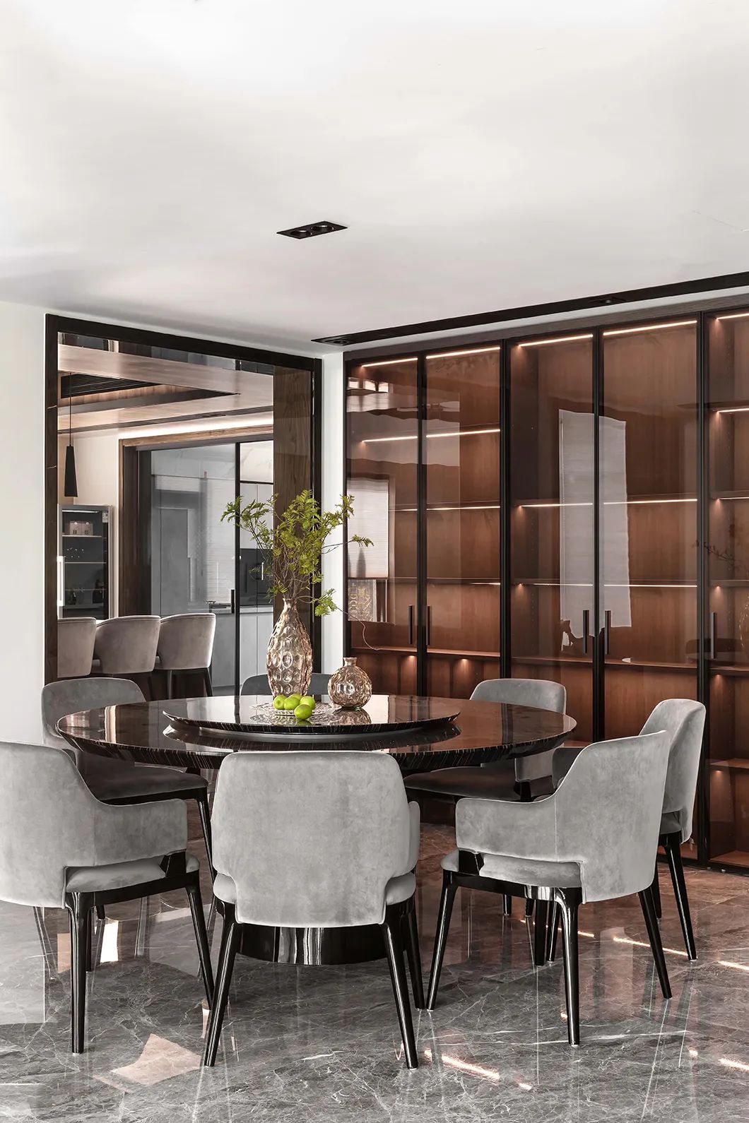 ![]() ![]() ![]() ![]() △一层餐厅 黑色木纹台面与丝绒质感的餐椅相得益彰,两种不同的材质,有一种不可言喻的张力于其中发酵。
