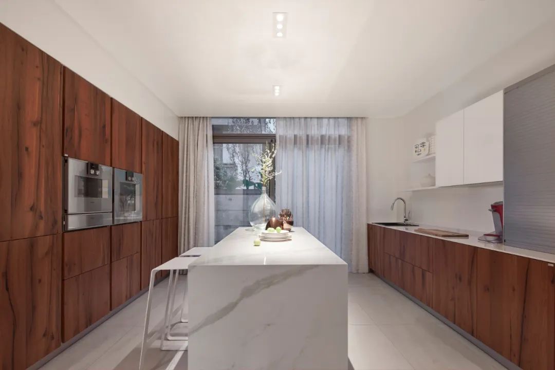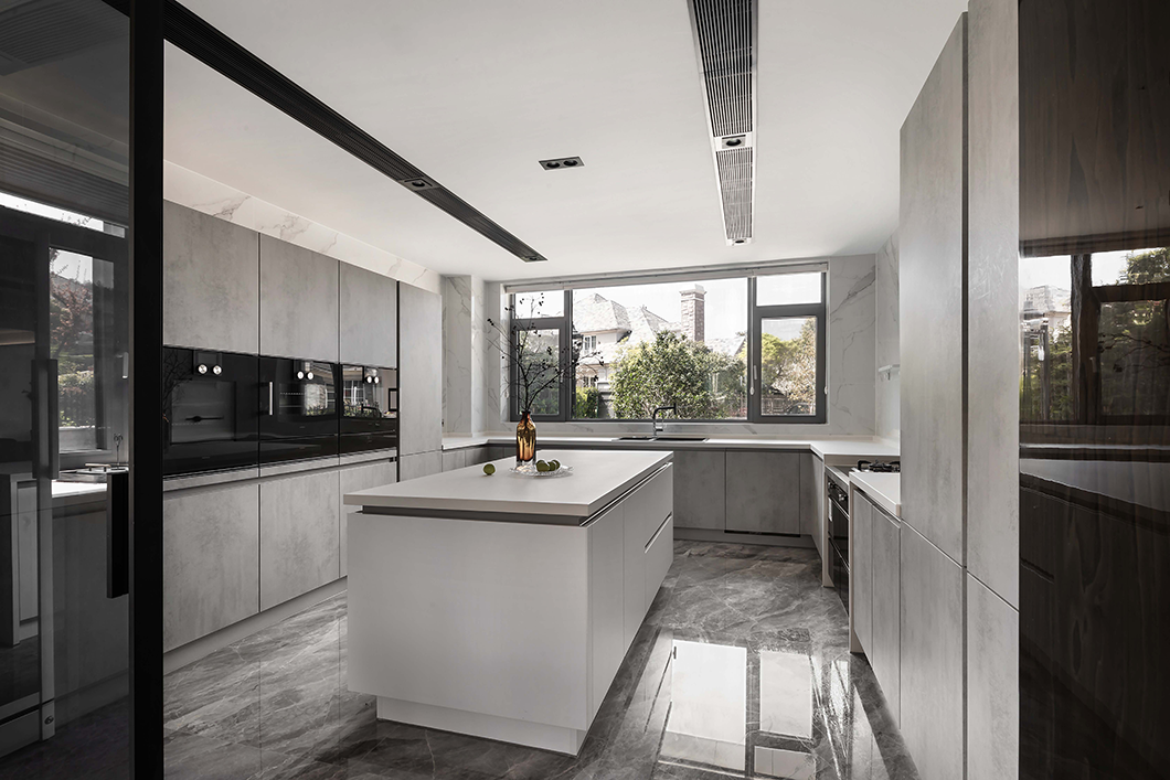 U型的厨房的流畅操作动线,让烹饪变得轻松自在,内嵌式家电让厨房功能实现超大化,使厨房运作有序而不凌乱。光线透过窗户洒入室内使得空间里多了一份柔软与平和。