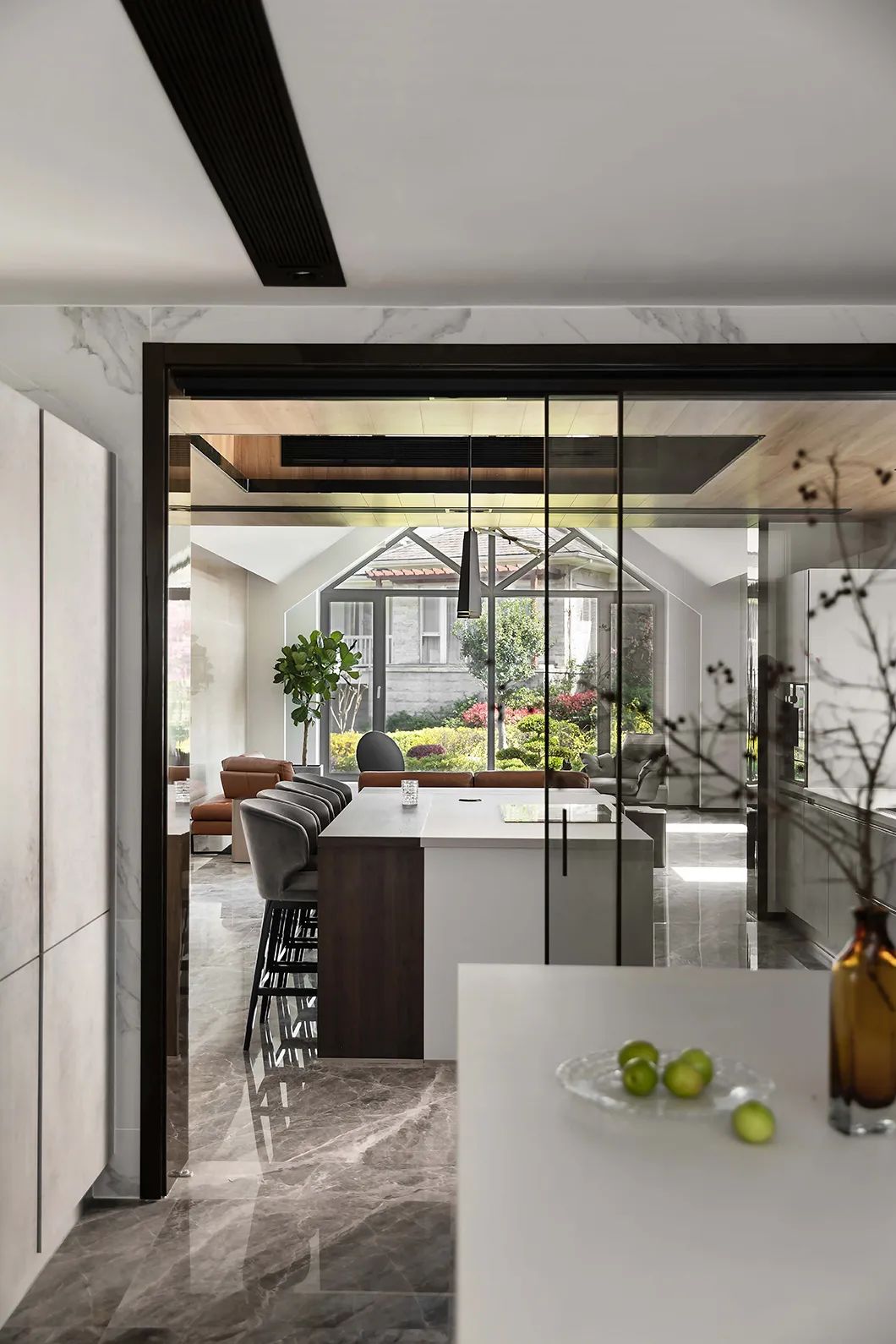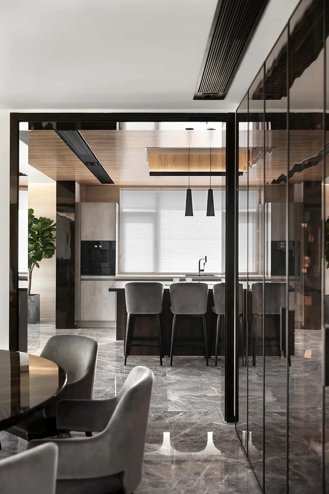 客厅与餐客厅间用两扇通透的灰色玻璃推门隔断,空间和视觉效果恰到好处。