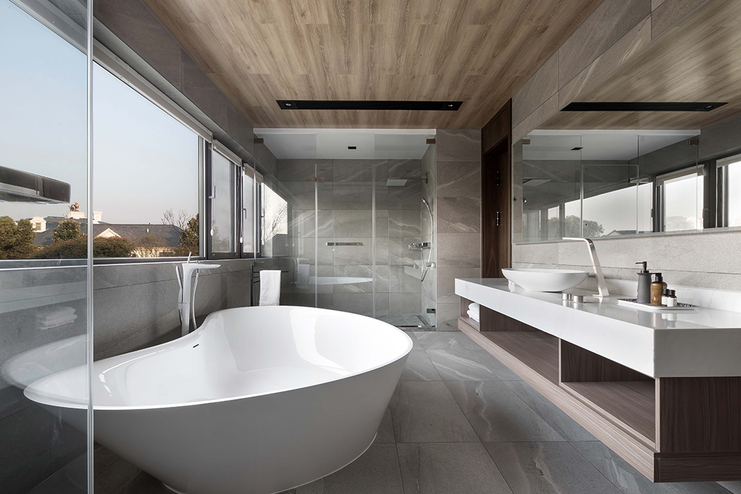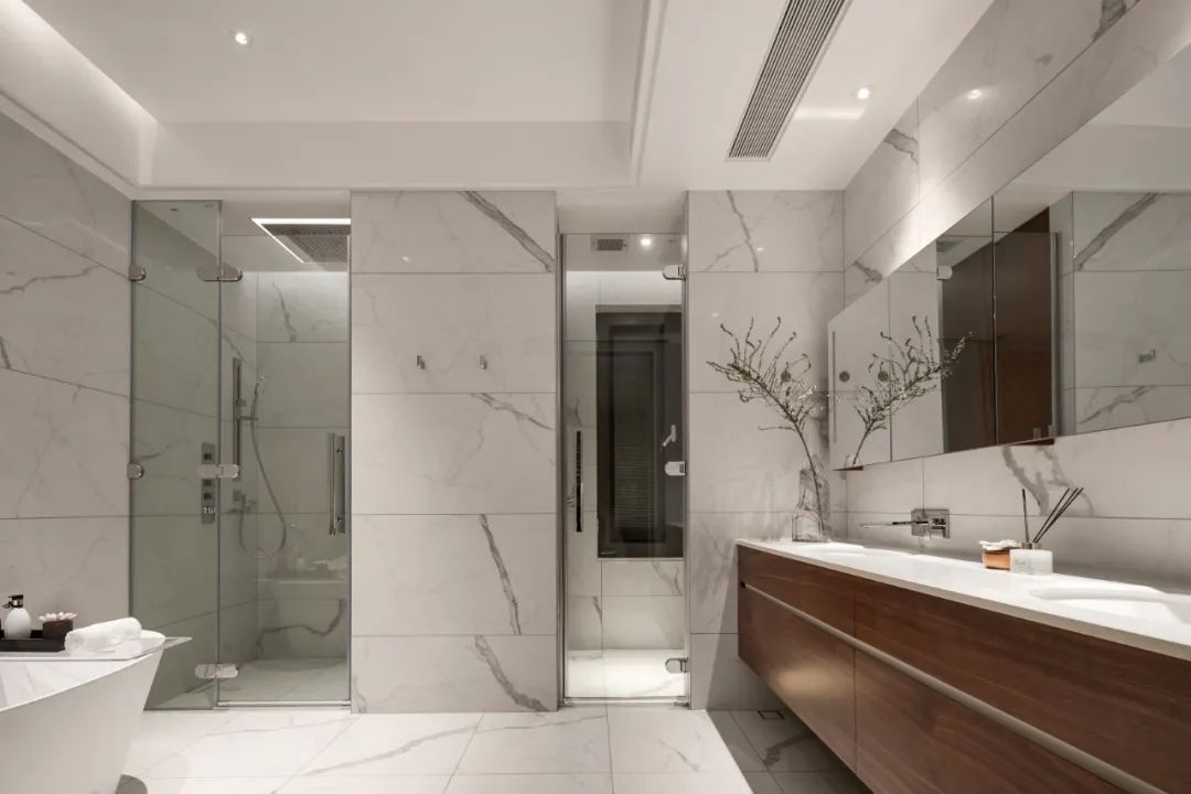 不同于常规的区分方式 ,通过大理石优美的纹理和细腻的饰面让空间更加层次感,不仅在视觉上扩大了主卫的空间效果,更将更多的自然光线引入其中,鹅卵石造型的台上盆,富有科技感。