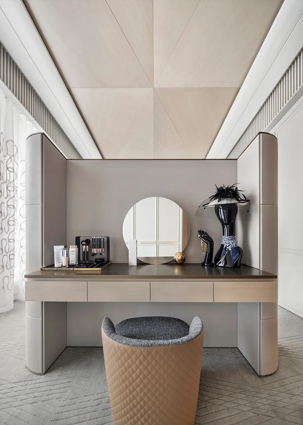 天花与墙壁精雕细琢,莹白的圆弧细节,结合经典家具,整体空间得以如欧泊石一般,呈现出多变的色彩维度。