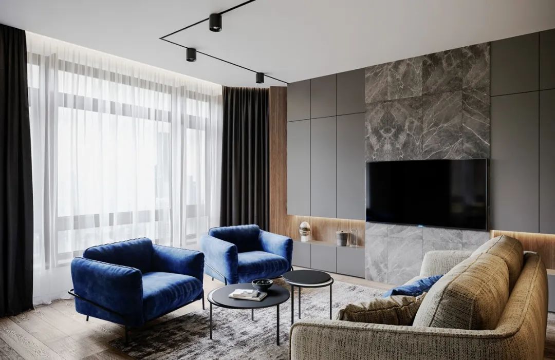 这套88㎡的住宅,从优雅中款款而来,超奢华的材质、超理性的色彩,高级灰与蓝色为我们勾勒出一个高贵而理性的空间。高级灰+蓝色,超优雅的冷色组合,就像是女王与权杖,相得益彰的美,呈现着很直观的诱惑与魅力,惊艳了世人。